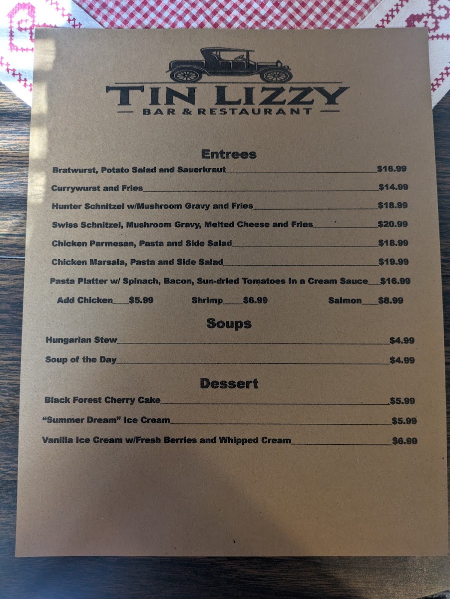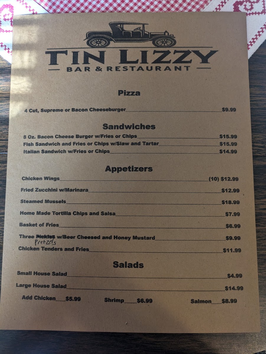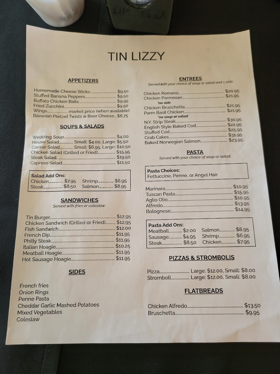 Welcome to the Tin Lizzy Restaurant & Tap Room Menu, where delicious meals and a cozy atmosphere await you. Located at 259 Main St, Youngstown, PA, this charming spot is perfect for enjoying everything from hearty comfort food to lighter, flavorful options. With a focus on local ingredients and bold flavors, the menu offers something for every taste, whether you're in the mood for a savory burger, fresh salad, or a comforting bowl of soup.